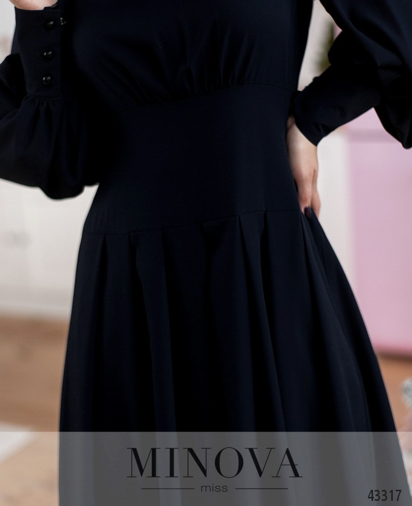 Минималистичное платье с воротником-стоечкой, подол присобран, отделён от лифа "пояском". Лиф также с вытачками на талии. Карманов нет. Рукава с длинными манжетами, на манжетах по три пуговицы. Застёжка - вшитая по спинке молния.