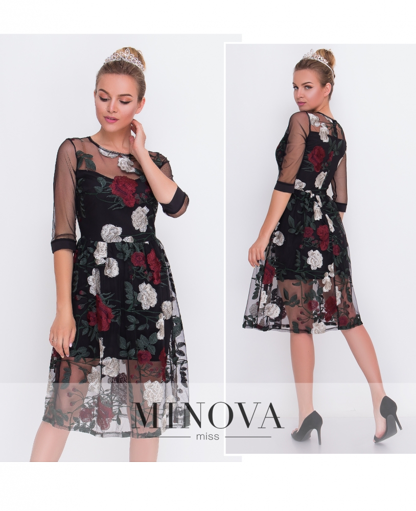 Очаровательное платье из комбинации и сетки, расшитой крупными розами. Длина рукава ¾. Пышный отрезной подол. На спинке платье застегивается на молнию.