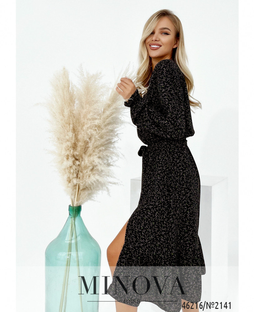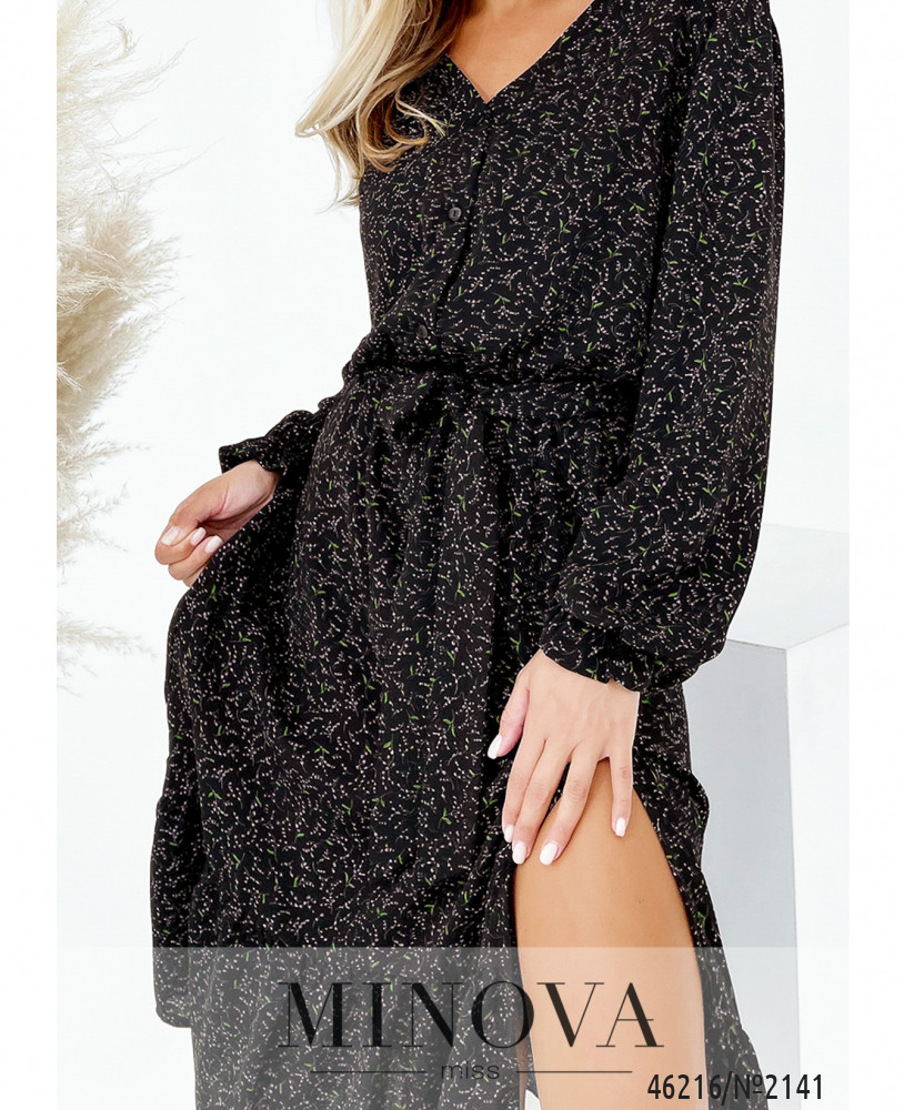 Нежное и романтичное платье с V-образным вырезом горловины и соблазнительным разрезом на подоле позволит выглядеть роскошно даже в повседневных образах. Модель дополнена длинными рукавами с оборками на резинках вместо манжет и застежкой на пуговицах от горловины до талии, расположенной спереди. По линии талии также вшита резинка.