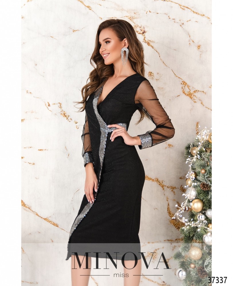 Праздничное вечернее платье приталенного силуэта из мягкой ткани с люрексом. Подшито на запАх и оторочено контрастной лентой с пайетками. Рукава из полупрозрачной сеточки, манжеты плотные, украшены пайетками. Застёжка – вшитая по спине змейка. Карманов нет. На спине продольные вытачки.