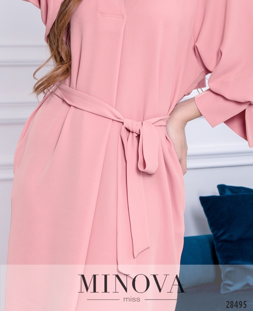 Свободное и легкое платье с V-образным вырезом и удлиненной спинкой. Платье со спущенными рукавами длины ¾, дополнены сборкой на резинке. Что бы акцентировать элегантную талию, есть поясок на шлейках, по бокам есть карманы. По спинке дополнительная тканевая вставка, чтобы придать платью фактуры. Изделие без дополнительных застежек. Платье можно сделать более повседневным добавив сумку-бананку в место пояса и одев обувь на низком ходу.