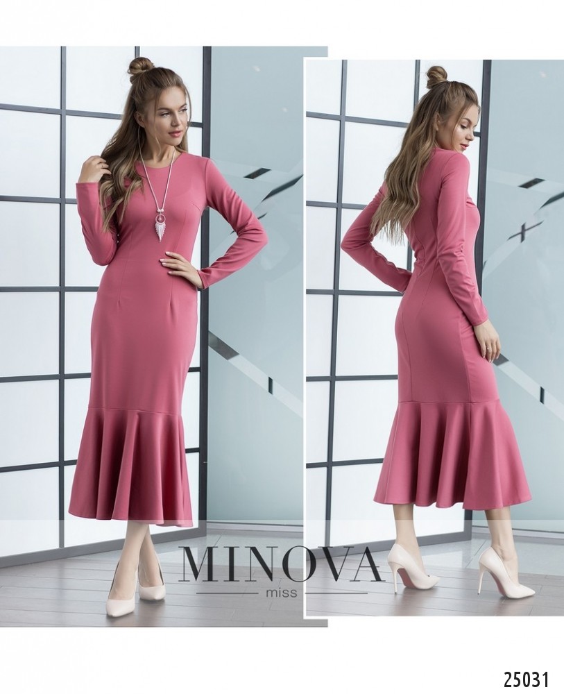 Очень женственное макси-платье с отрезным подолом из рюшей а-ля «хвост русалки». Платье по фигуре с длинными рукавами, на спинке застегивается на скрытую молнию. Образ дополняет подвеска, которая входит в комплект.