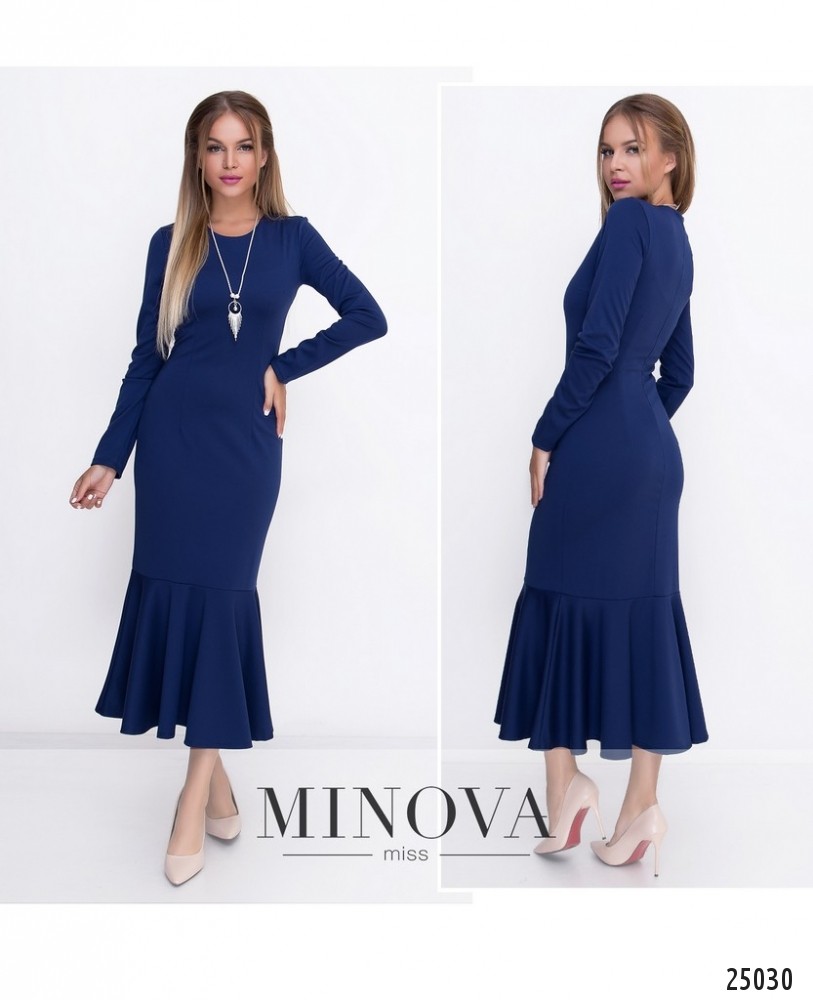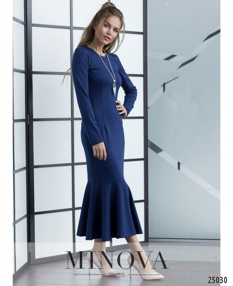 Очень женственное макси-платье с отрезным подолом из рюшей а-ля «хвост русалки». Платье по фигуре с длинными рукавами, на спинке застегивается на скрытую молнию. Образ дополняет подвеска, которая входит в комплект.