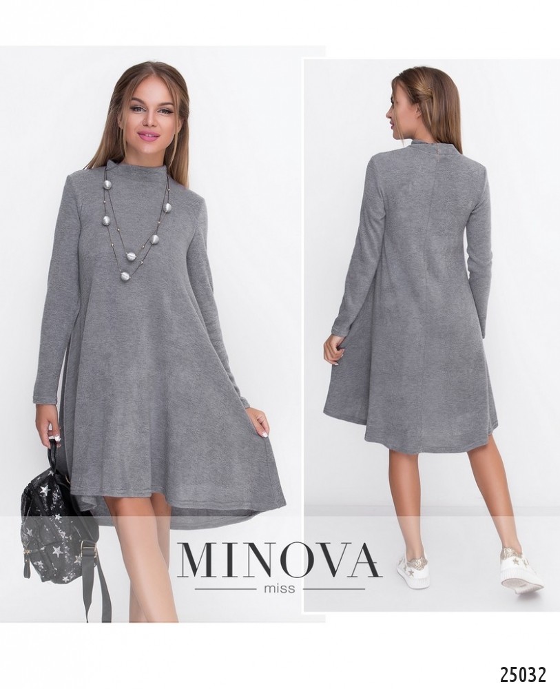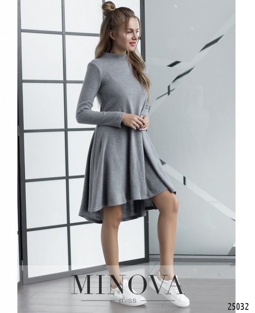 Уютное теплое расклешенное платье с высокой горловиной и длинными рукавами. Спинка немного удлинена. Платье изготовлено из очень приятного мягкого материала.
