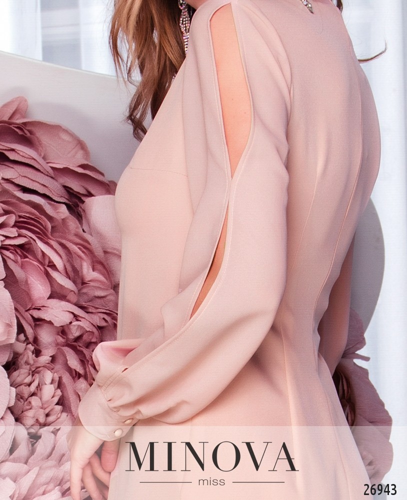 Элегантное, романтичное платье прямого силуэта с оригинальным вырезом. Воротник декорирован ярким пришивным украшением (украшение съёмное). Длинные, легкие рукава с креп-шифона с разрезами на наружной стороне на манжете с пуговицами. По спинке идет потайная молния и выточки по задней планке.