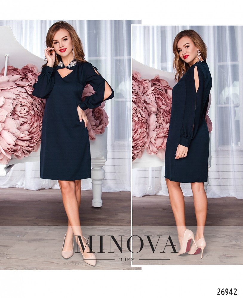 Элегантное, романтичное платье прямого силуэта с оригинальным вырезом. Воротник декорирован ярким пришивным украшением (украшение съёмное). Длинные, легкие рукава с креп-шифона с разрезами на наружной стороне на манжете с пуговицами. По спинке идет потайная молния и выточки по задней планке.