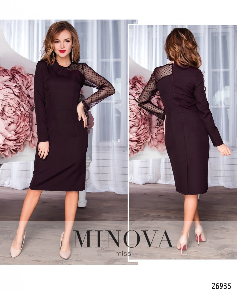 Оригинальное приталенное платье, декорированное оборкой по линии декольте. Особой элегантности и нарядности образу придает сеточка с узором, из которой выполнен один рукав и часть платья вокруг горловины.