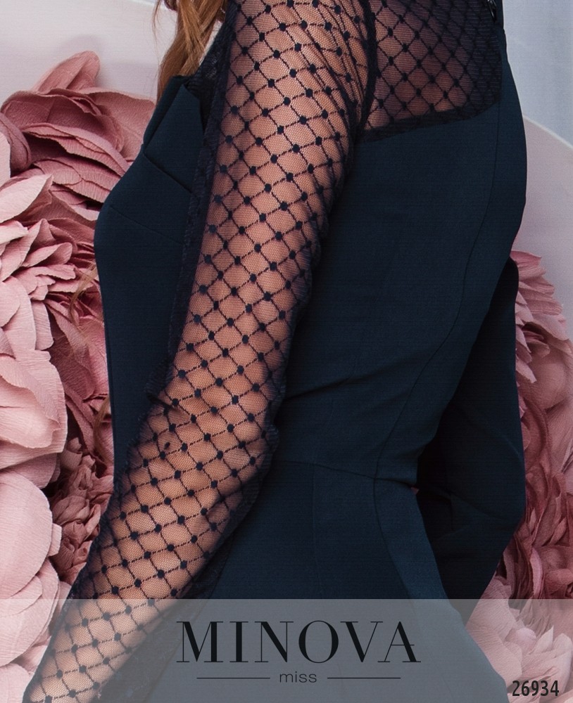 Оригинальное приталенное платье, декорированное оборкой по линии декольте. Особой элегантности и нарядности образу придает сеточка с узором, из которой выполнен один рукав и часть платья вокруг горловины.