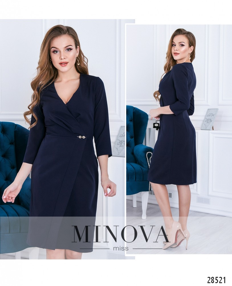 Классическое платье с вырезом и подолом на запАх. Отрезной лиф с рукавами ¾ украшен защипами, создающими эффект драпировки. Отрезная линия талии украшена пришитой декоративной деталью. На спине платье застегивается на скрытую молнию.