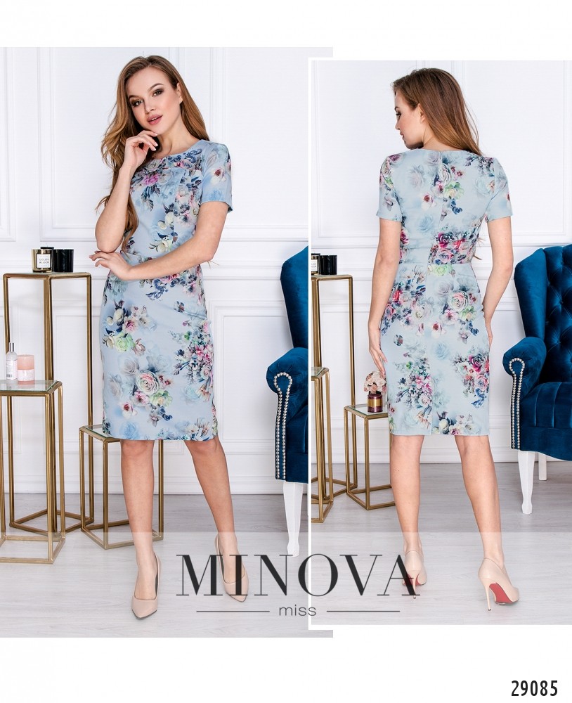 Платье – футляр с короткими рукавами в нежный цветочный рисунок. Платье прекрасно подчеркивает женственность силуэта засчет отрезной талии и вытачек. На спинке платье застегивается на скрытую молнию и дополнено разрезом по линии шага.