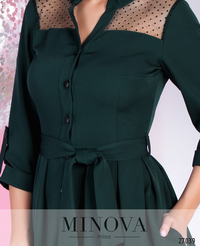 Нарядное платье-рубашка со съемным поясом и расклешенной юбкой. Лицевая сторона полностью застегивается на пуговицы. Платье обыграно кокеткой из сетки в горошек. Приталенный лиф с вытачками на груди оформлен воротником – стойкой и рукавами ¾ с манжетами на пуговицах. Отрезной от талии подол с карманами дополнен вставкой из сетки в горошек, открывающим ножки.