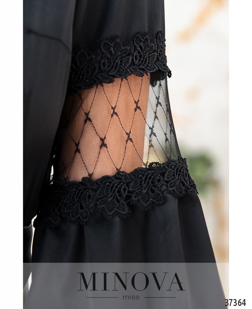 Женственное шёлковое платье с кружевом на подоле и на плечах. Силуэт приталенный, в пояс вшита резинка, подол расклешён. На груди – поперечные вытачки. Рукава со вшитой на запястьях резинкой. В комплекте широкий пояс. Вырез горловины V-образный. Застёгивается на пуговицы, расположенные спереди на планке, от горловины до подола. Пояс/аксессуар входит в комплект.