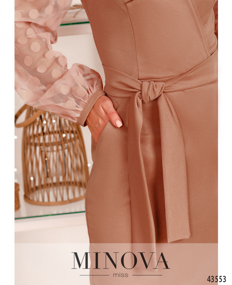 Стильное платье с поясом и полупрозрачными рукавами с небольшими прорезиненными манжетами. Подшито на запАх, по бокам - врезные карманы, застёжка - молния, вшитая по спинке. Силуэт приталенный, сзади на подоле шлица. Ткань с люрексом.