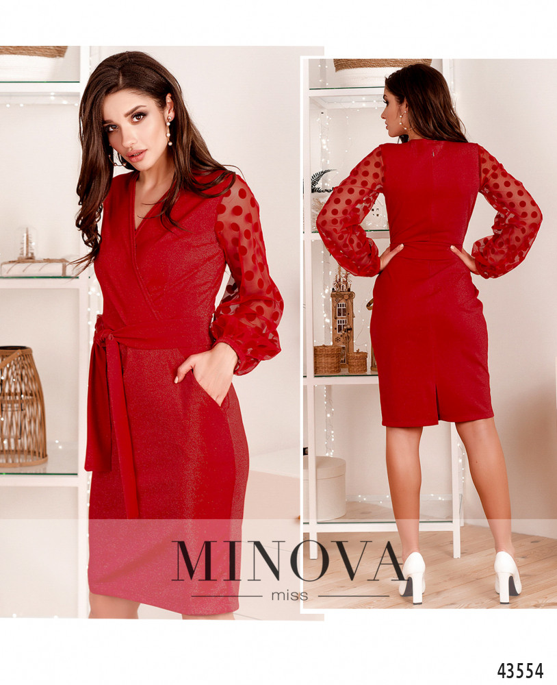 Стильное платье с поясом и полупрозрачными рукавами с небольшими прорезиненными манжетами. Подшито на запАх, по бокам - врезные карманы, застёжка - молния, вшитая по спинке. Силуэт приталенный, сзади на подоле шлица. Ткань с люрексом.