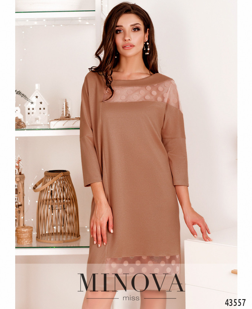 Романтичное платье без застёжек и карманов, декорировано вставками сеточки с горошком на груди и подоле. Рукава без манжет, вырез горловины "лодочка". Спереди продольный шов.