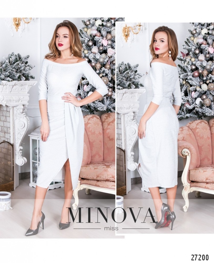 Эффектное платье-миди с открытыми плечиками и запАхом из мерцающего люрекса. Отрезной лиф с рукавами ¾ и отрезным поясом-вставкой оформлен широким вырезом-лодочкой, который можно носить как совсем опущенным, так и немного подняв на плечи. Подол с пришитым запАхом драпируется в легкие складки от пояса. На спине платье застегивается на молнию.