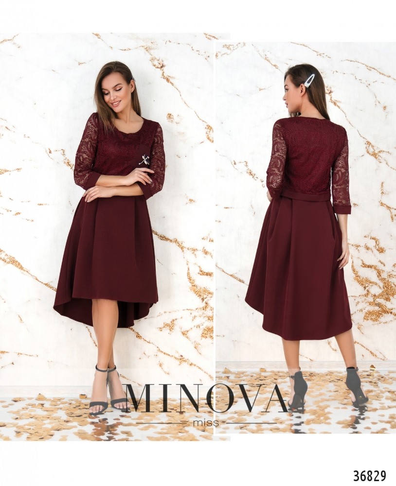 Нарядное платье с нежным кружевом из новой коллекции Minova станет прекрасным выбором для праздника или более официального торжественного мероприятия. Платье из мягкой ткани, сверху подшита кружевная накидка длиной до талии, укреплённая плотным манжетом снизу. Рукава длиной 3/4 также с небольшими манжетами, полностью кружевные, без подкладки. На груди и на нижней, и на верхней ткани – небольшие вытачки. Сверху справа располагается гладкий кармашек с брошью в виде стрекозы. На платье по бокам врезные карманы, застёжки на платье отсутствуют, вырез горловины полукруглый, широкий. Подол по спинке немного длиннее. Длина платья миди, поэтому стоит выбирать обувь на танкетке или каблуке любой высоты. Украшение входит в комплект.