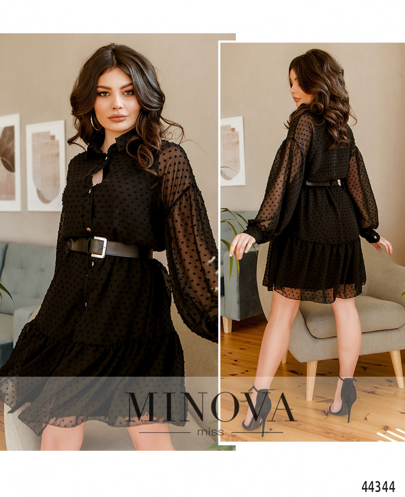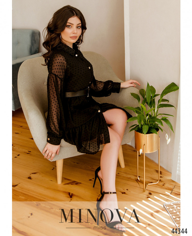 Романтичное платье с отложным воротничком и рядом пуговиц спереди на планке. Рукава с манжетами, на манжетах по одной пуговице. Рукав со спущенной линией плеча, к манжету зауженный. Под полупрозрачным верхним слоем - мягкая подкладка. Карманов нет, на подоле оборки.