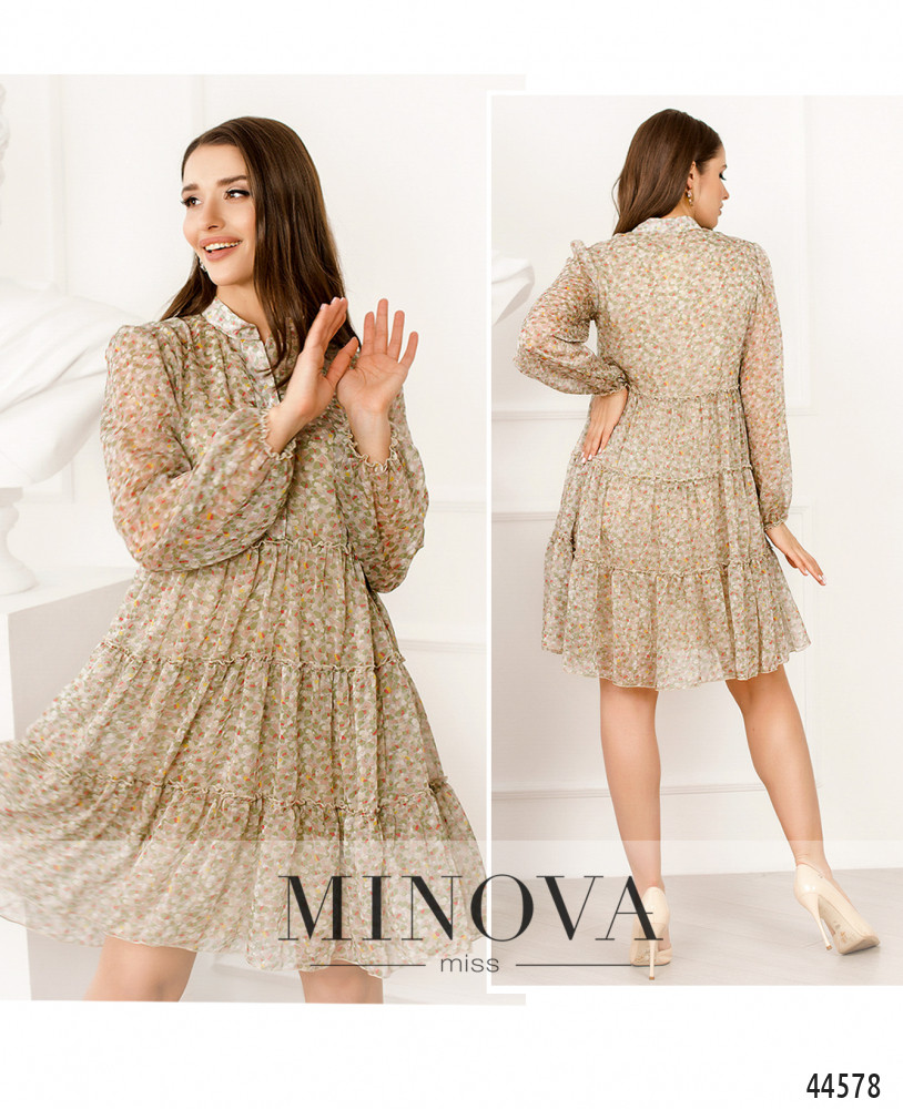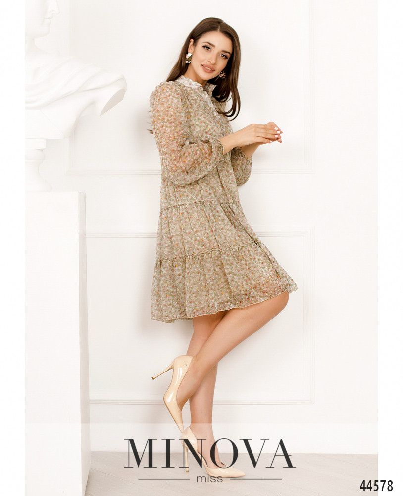 Нежное воздушное платье с мягкой подкладкой и верхним полупрозрачным слоем с несколькими рядами оборок. Рукава свободные, без подкладки, на запястьях присобраны резинкой. Воротник-стоечка, от него - ряд элегантных пуговиц до груди. Карманов нет.
