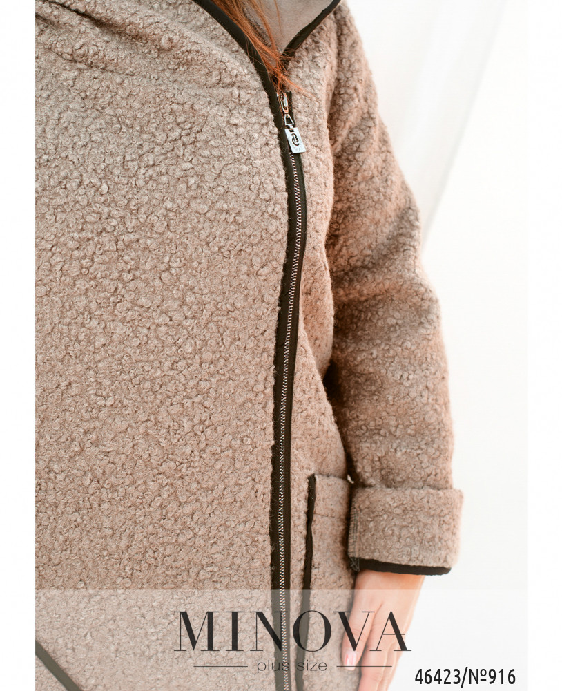 Оригинальное пальто большого размера с капюшоном и двумя накладными карманами, застёгивается на диагональную молнию. Рукава без манжет, подкладки нет.
