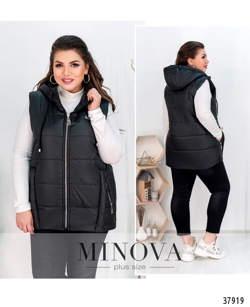 Стильная простёганная жилетка батал с капюшоном и врезными карманами по бокам. На левой стороне груди – небольшая декоративная нашивка. Застёгивается на молнию, расположенную по центру. С подкладкой.