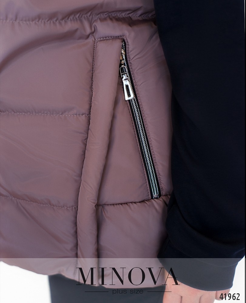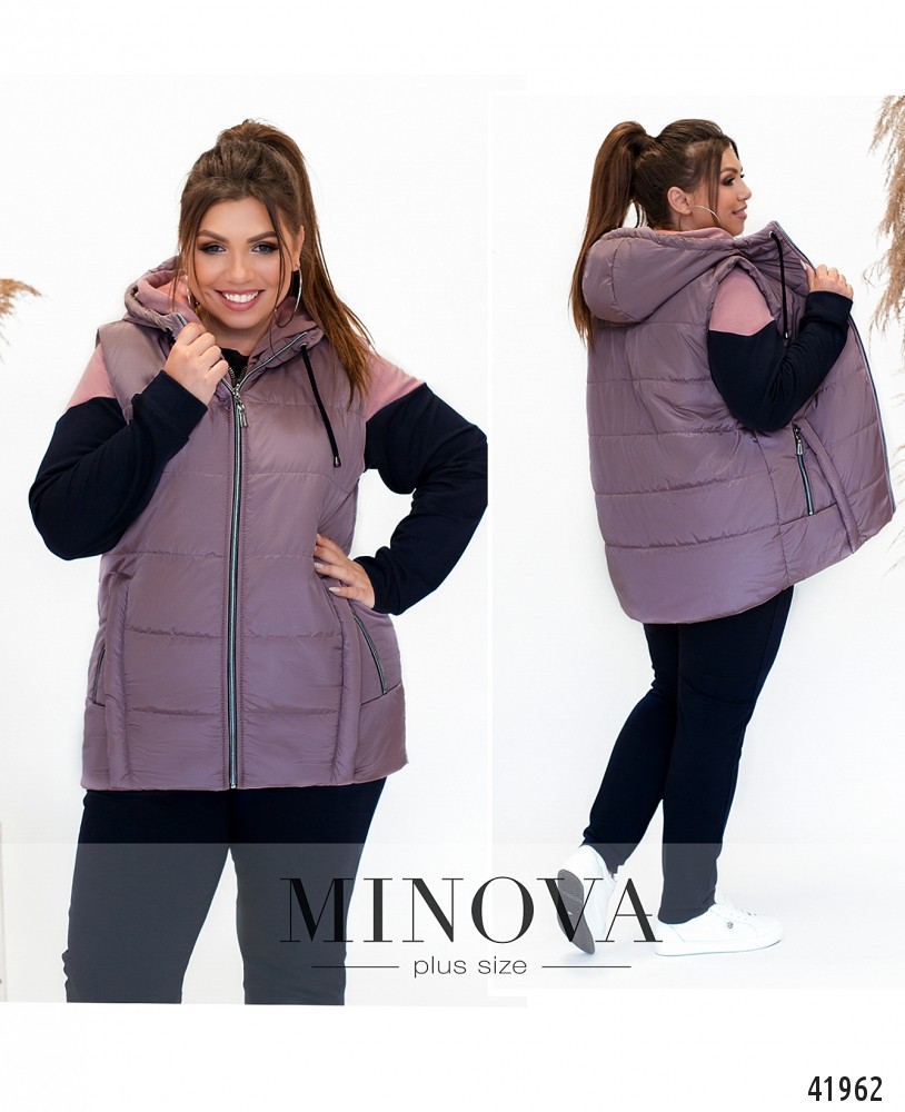 Стильный и удобный простёганый жилет батал с подкладкой и капюшоном. Через капюшон пропущен шнурок. По бокам - врезные карманы с молниями. Застёгивается на молнию по центру.