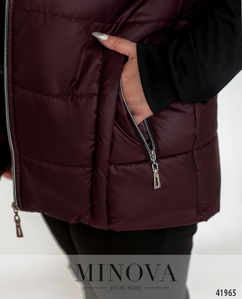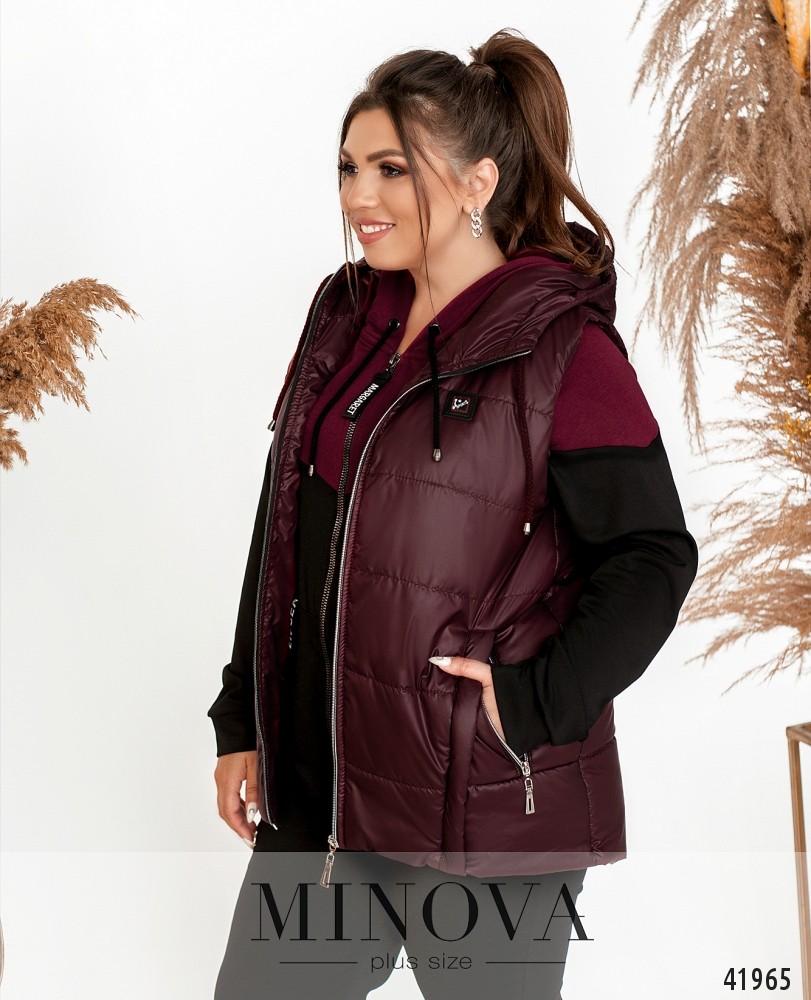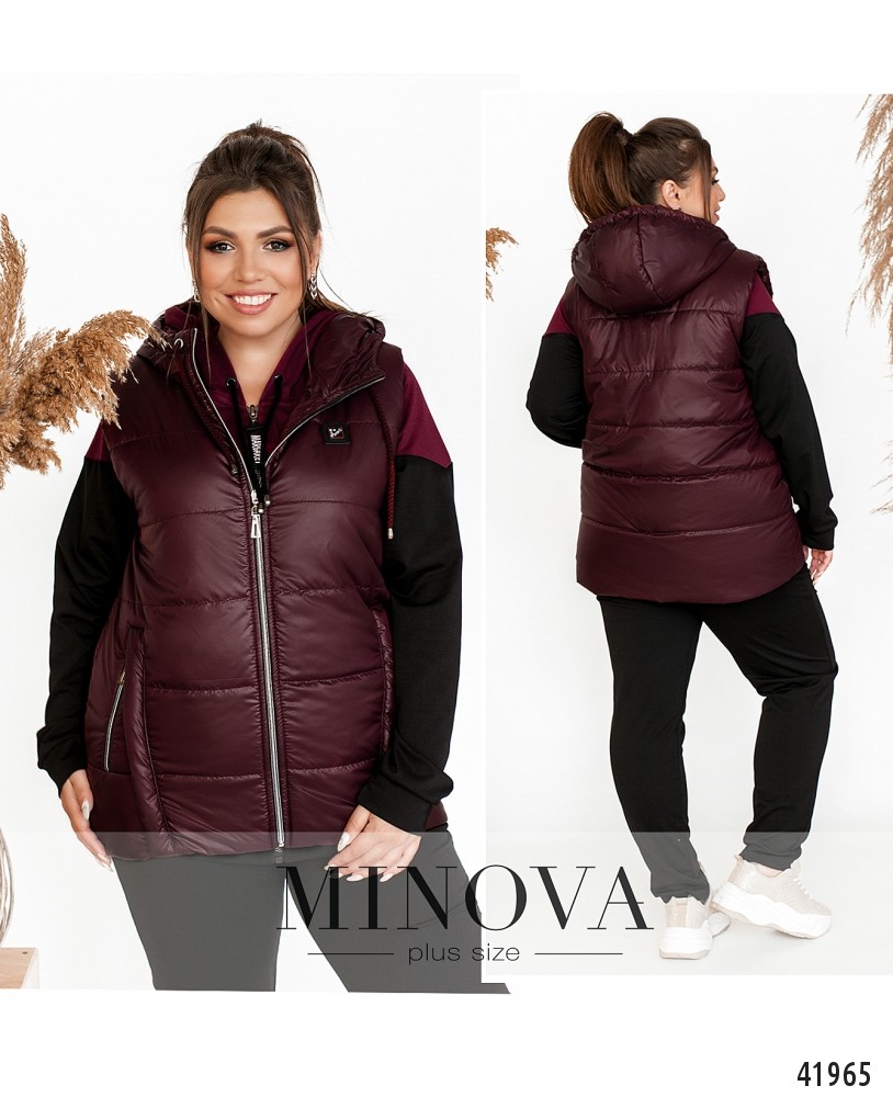 Стильный и удобный простёганый жилет батал с подкладкой и капюшоном. Через капюшон пропущен шнурок. По бокам - врезные карманы с молниями. Застёгивается на молнию по центру.