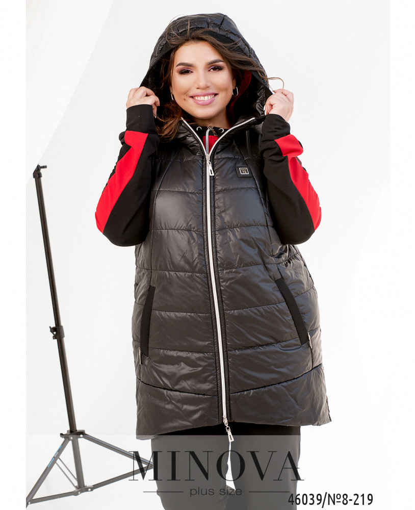 Привлекательный жилет батал с капюшоном, с подкладкой, простёганный. По бокам - врезные карманы с молнией. Застёгивается на молнию, расположенную по центру, от капюшона до низу.