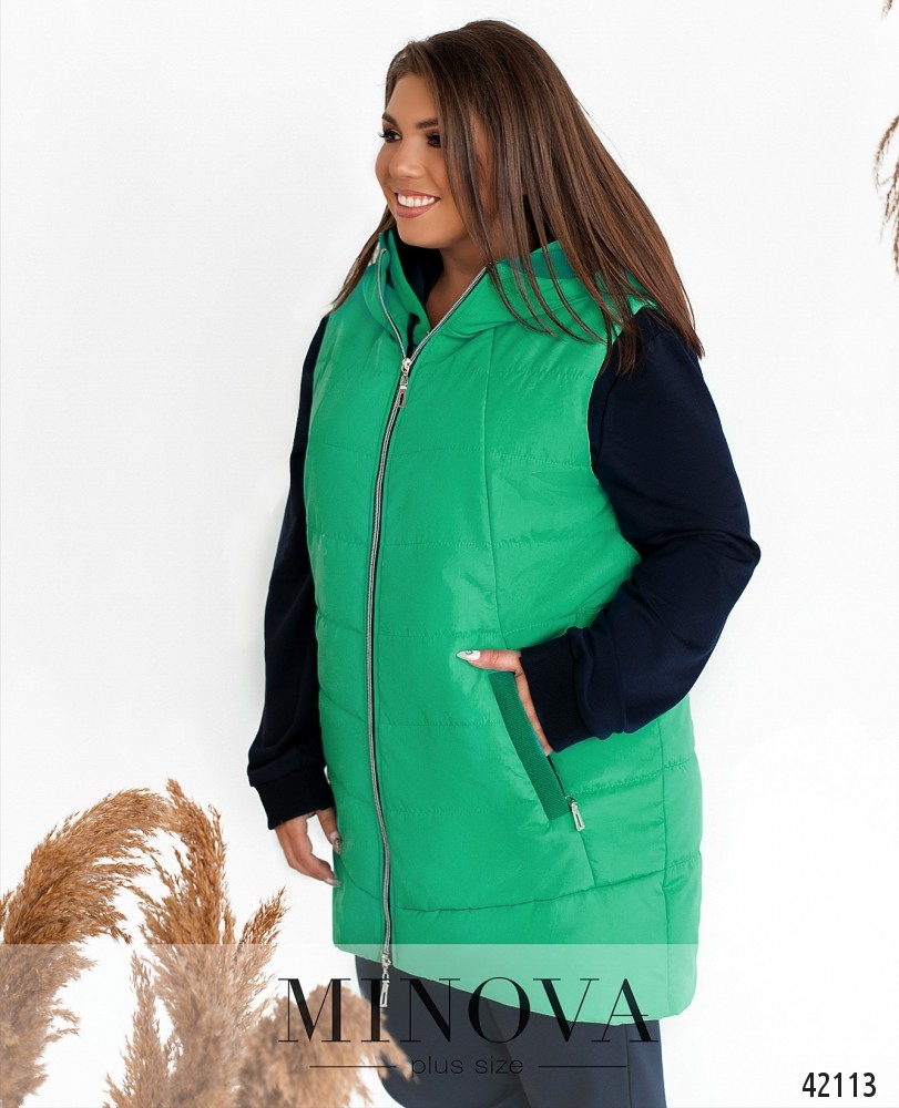 Привлекательный жилет батал с капюшоном, с подкладкой, простёганный. По бокам - врезные карманы с молнией. Застёгивается на молнию, расположенную по центру, от капюшона до низу.