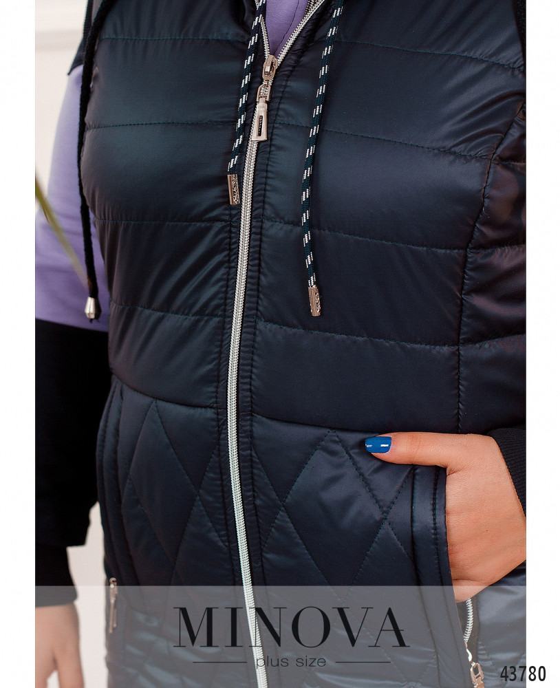 Комфортный жилет большого размера из простёганной ткани; сверху простёгана горизонтально, в нижней части - ромбами. По бокам - врезные карманы на молнии, спереди по центру также молния. В наличии капюшон, который не отстёгивается, через него пропущен шнурок. Жилет с подкладкой. Проймы с резинкой.