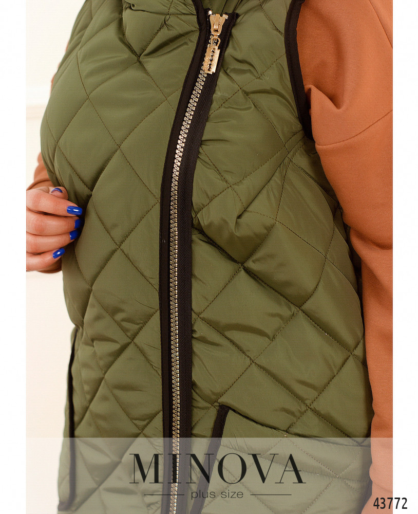 Стильный жилет большого размера с яркой подкладкой, ткань простёгана. Жилет с капюшоном, с накладными карманами и диагональной молнией; под ней - ткань, которая защищает от ветра. Капюшон не отстёгивается.