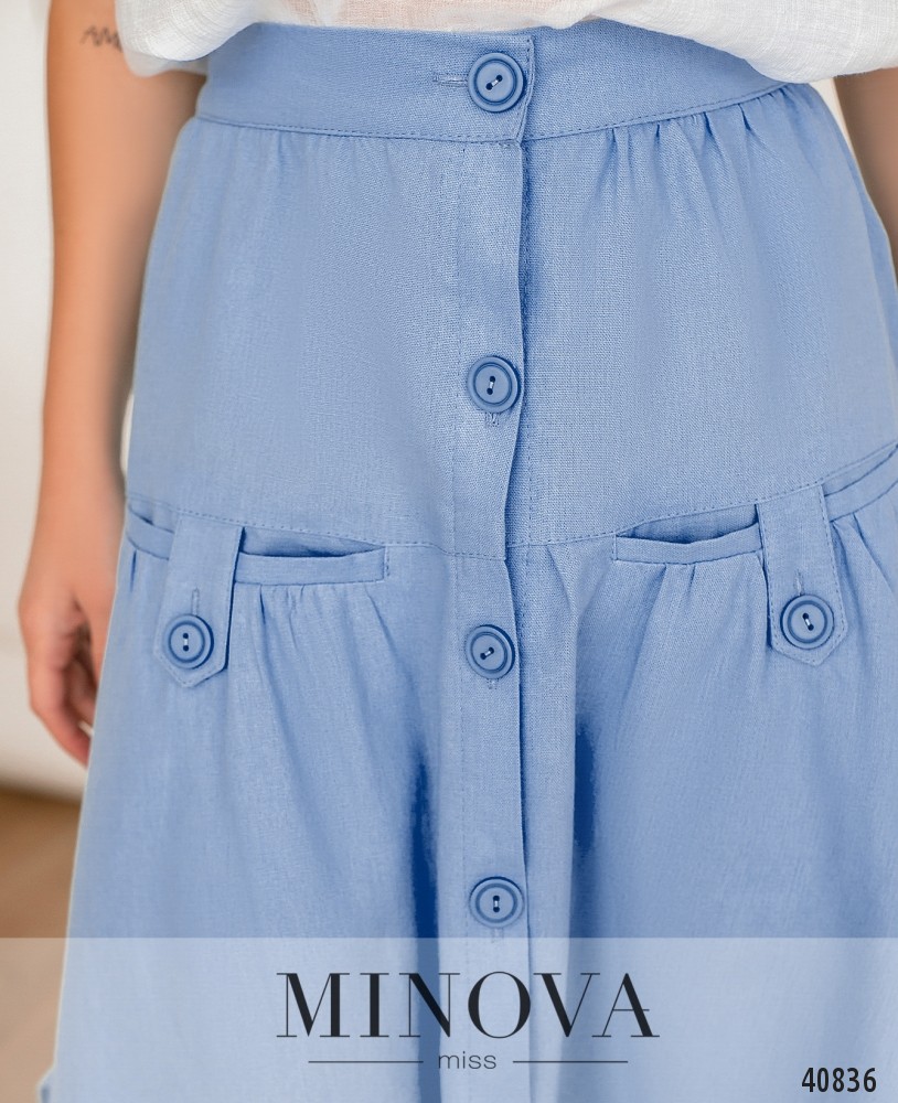 Лёгкая минималистичная юбка-солнце, застёгивается на ряд пуговиц на планке, спереди - два врезных кармана с клапанами. В пояс сзади вшита резинка. По бокам подола - скруглённые разрезы.