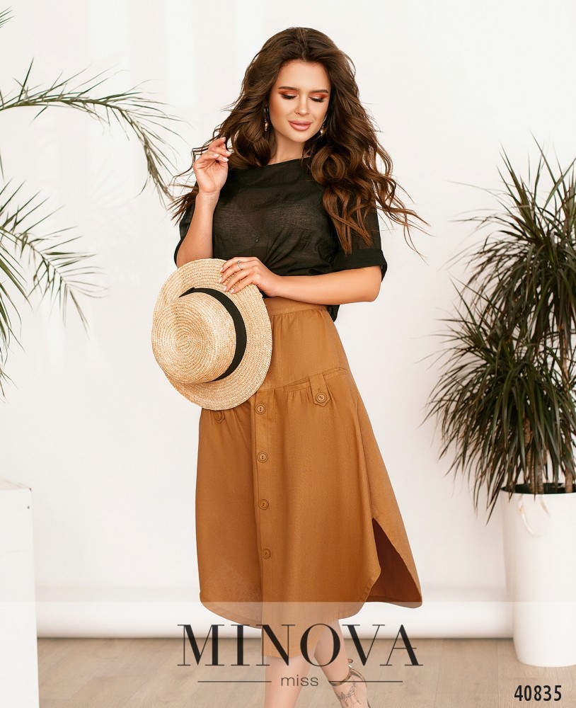 Лёгкая минималистичная юбка-солнце, застёгивается на ряд пуговиц на планке, спереди - два врезных кармана с клапанами. В пояс сзади вшита резинка. По бокам подола - скруглённые разрезы.