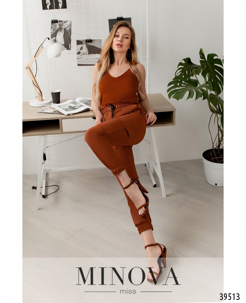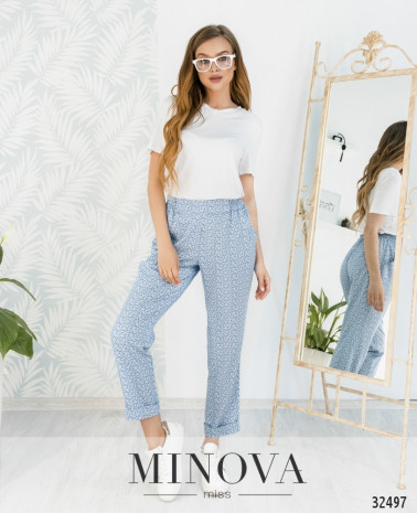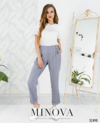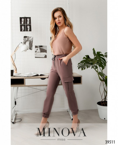 Дуже привабливі прямі брюки класичного крою зі «стрілочками». Брюки з високою посадкою, до поясу вшита резинка, а зверху нашиті невеликі оборки; в наявності широкі шлівки, через які пропущений пояс. З боків – кишені в шві, по центру – декоративна ширинка.