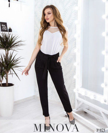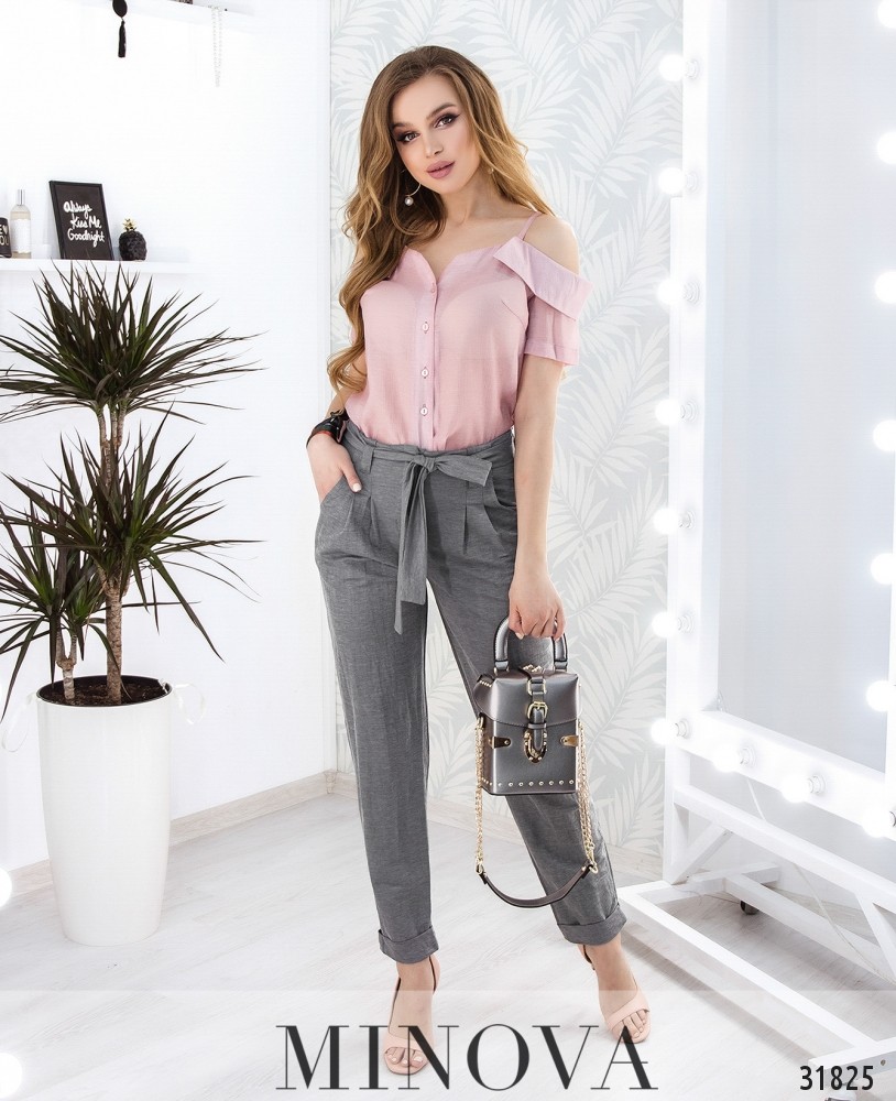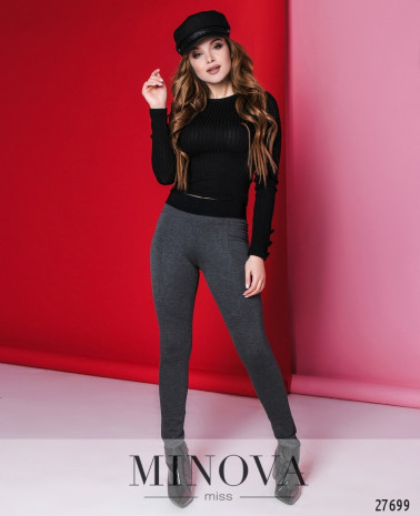 Класичні брюки з напрасованими стрілочками, з кишенями, але без застібки: з боків пояса вшиті резинки. Є декоративна ширинка.