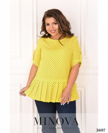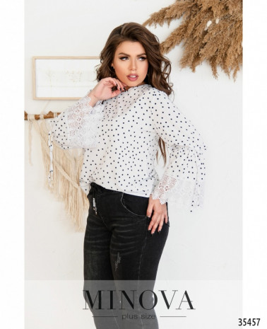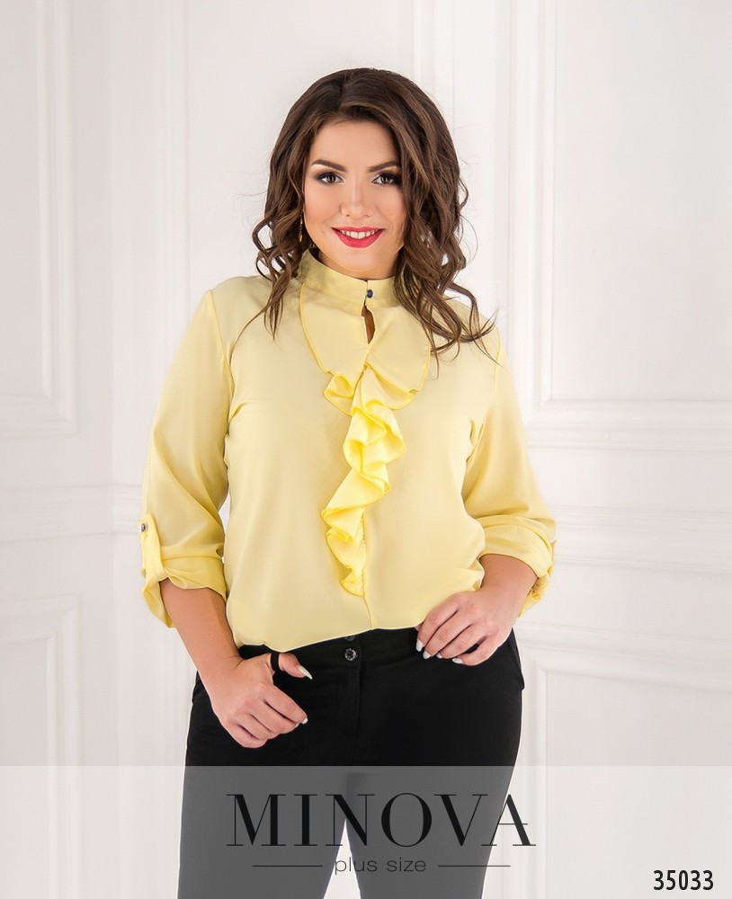 Приваблива блуза батал вільного крою з невеликим жабо, з рукавами повної довжини, які регулюються за допомогою стрічки та гудзика. На рукавах – невеликі манжети з гудзиками. Кишень немає. Комірець-стійка, застібається на один гудзик з петелькою.