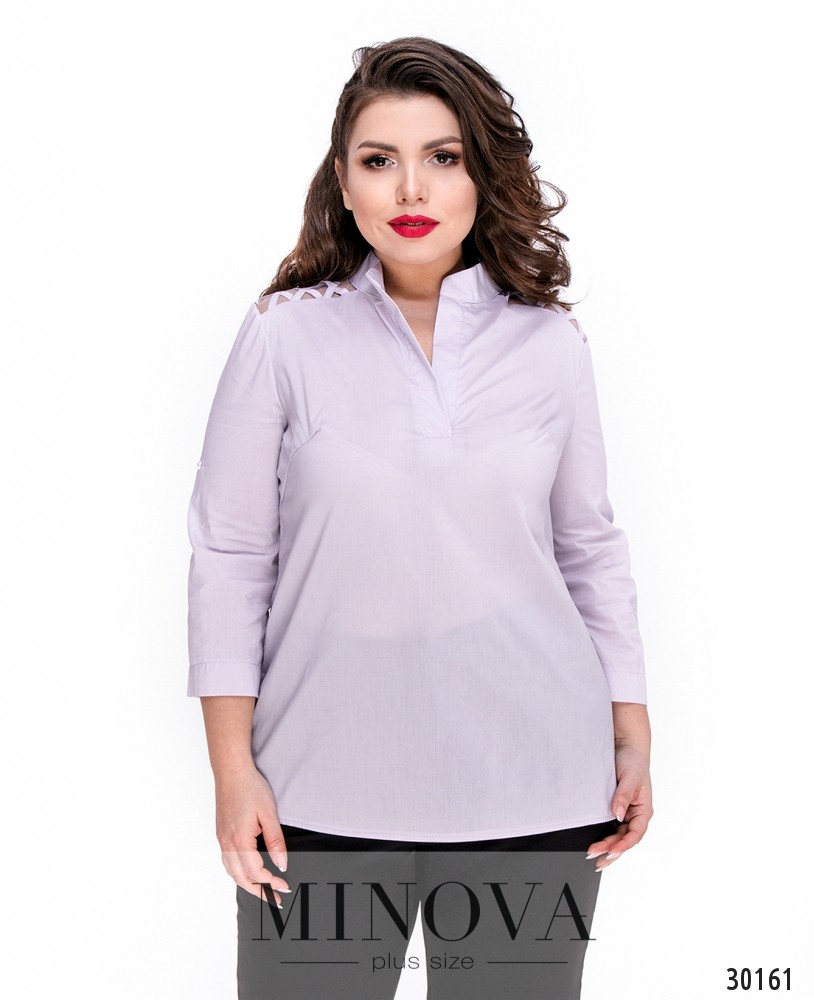 Блуза прямого кроя с V-образным вырезом и рукавами ¾. Рубашка украшена сеткой и шнуровкой на плечах. Вырез оформлен воротником-стойкой. Рукава подворачиваются и крепятся на пуговицу с планкой.
