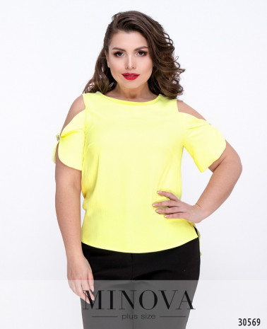 Блуза прямого кроя с объемными короткими рукавами и отложным воротником. Вырез капля застегивается на пуговицу.