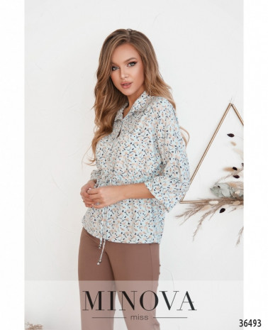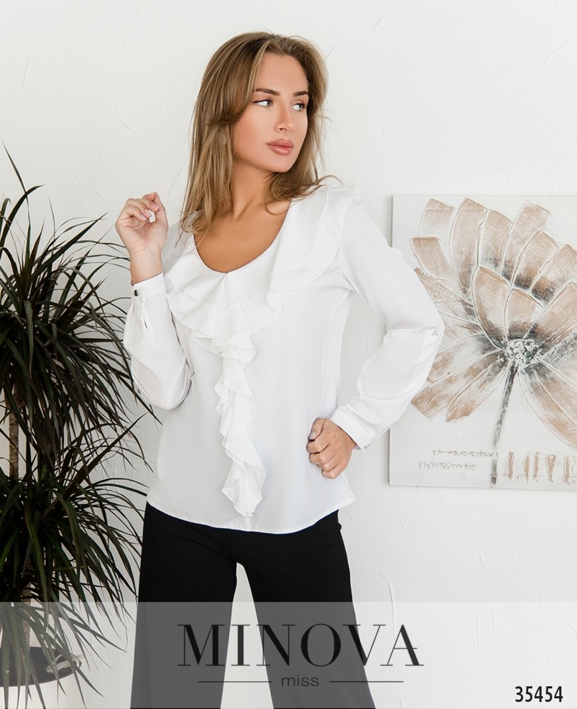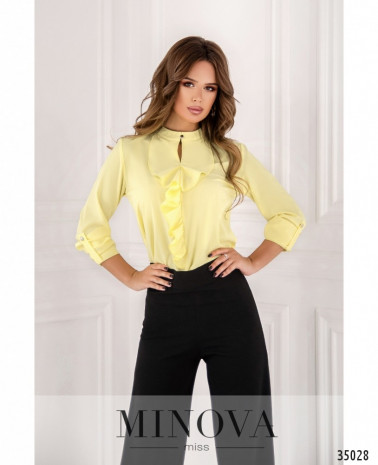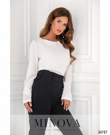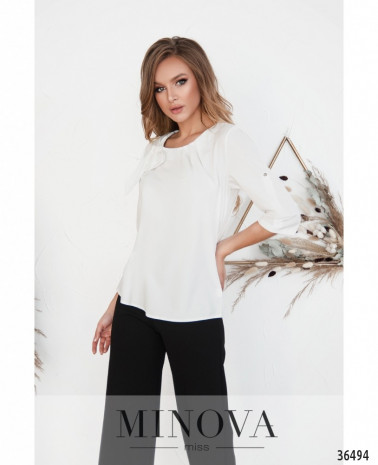 Класична блуза вільного крою виконана без застібок та кишень, виріз горловини широкий, півкруглий, рукава повної довжини, без манжетів, але двохшарові: основной рукав прямий, але его охоплює ще один шар, призібраний на рівні манжета та зав\'язаний у вигляді великого банта. На грудях – невеликі діагональні виточки з низу догори. Прикраса не в комплекті. Пояс/аксесуар не в комплекті.