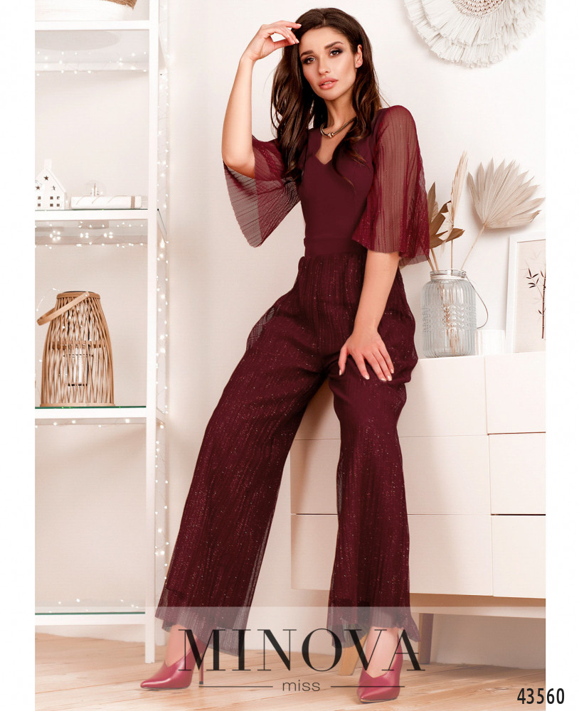 Оригінальний комбінезон з подвійними брюками - нижня тканина м\'яка, верхня прозора, легка. Рукава напівпрозорі, без підкладки, розкльошені. Виріз горловини V-форми. Застібка - вшита по спинці блискавка. Кишень немає. Ліф з костюмної ткани з повздовжніми округленими виточками.