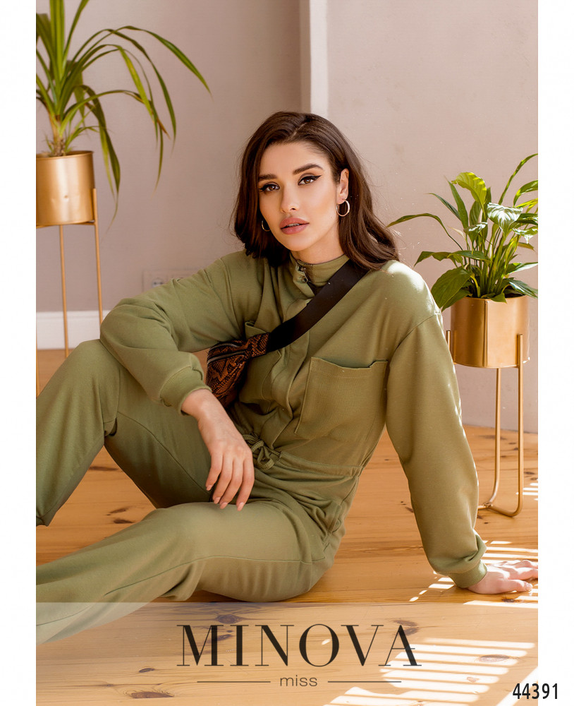 Оригінальний та м'який комбінезон. Через пояс пропущено шнурок, манжети рукавів та брюк з м'якою резинкою. З боків - кишені в шві. На грудях накладні кишені. Застібається на блискавку, приховану під планкою, від комірця-стійки до талії.