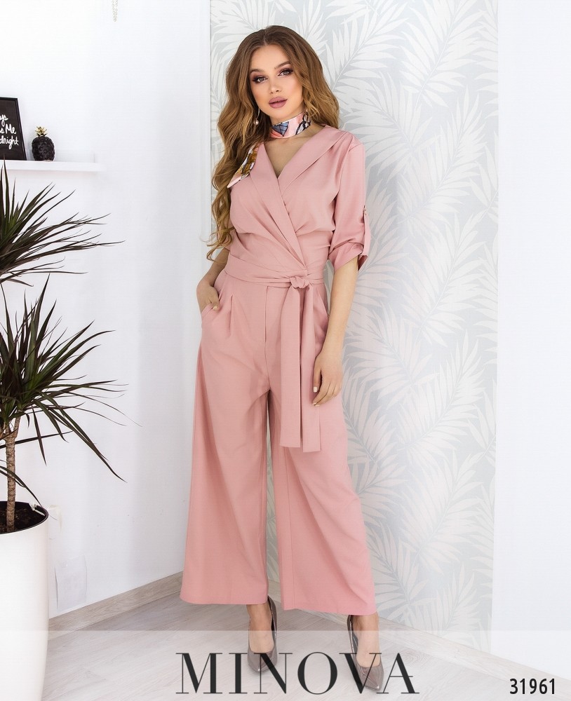 Идеальный наряд для работы, прогулок, вечеринки – и как это всё сочетается в одном комбинезоне от Minova? Очень просто: лёгкий льняной брючный комбинезон с запАхом подчеркнет женственность и добавит строгости благодаря зауженным брюкам и открытым плечам. Застёгивается на вшитую по спинке застёжку-молнию до талии. Пояс идёт в комплекте; на брюках – карманы. Прекрасный вариант для фигуры типа «прямоугольник», «песочные часы» или «груша». Аккуратные туфли-лодочки прекрасно дополнят романтический или деловой образ.