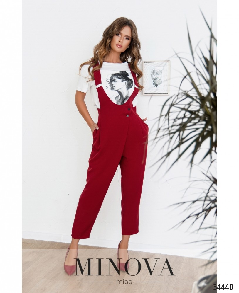 Необычный и очень стильный комбинезон из новой коллекции Minova позволит создать привлекательный городской look, просто добавив к нему блузку или свитшот, а обувь может быть любой, на каблуке или плоском ходу. Комбинезон по спинке выше, чем спереди, шлейки не регулируются, удерживаются на металлических прямоугольниках спереди. Застёгивается комбинезон на запАх: ткань удерживается с помощью двух пуговиц, а под этой тканью – вшитая тонкая змейка. В наличии карманы по бокам. Благодаря особенностям фасона комбинезон подчёркивает линию талии с помощью очень высокой посадки. Прекрасный выбор на каждый день для девушек с любым типом фигуры, можно выбрать яркий или тёмный вариант, а также в наличии пастельные оттенки.