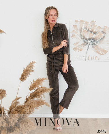 Вельвет снова в моде, и это прекрасно, ведь он такой мягкий, уютный и тёплый! В новом каталоге женской одежды от Minova ты найдёшь очень минималистичные и строгие вельветовые комбинезоны, с гладкой подкладкой. Верх выполнен в виде рубашки, с отложным воротничком и двумя вместительными накладными карманами. По центру располагается змейка до пояса с круглым бегунком. Рукава полной длины. Брюки прямые, по бокам – врезные карманы. В пояс вшита широкая лента, которую можно затянуть и сделать силуэт более приталенным. Однотонность тёмной расцветки позволит выбирать самые яркие и привлекательные аксессуары! Обувь допустима любая.