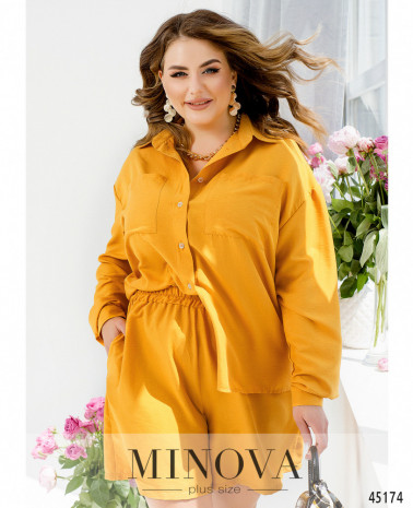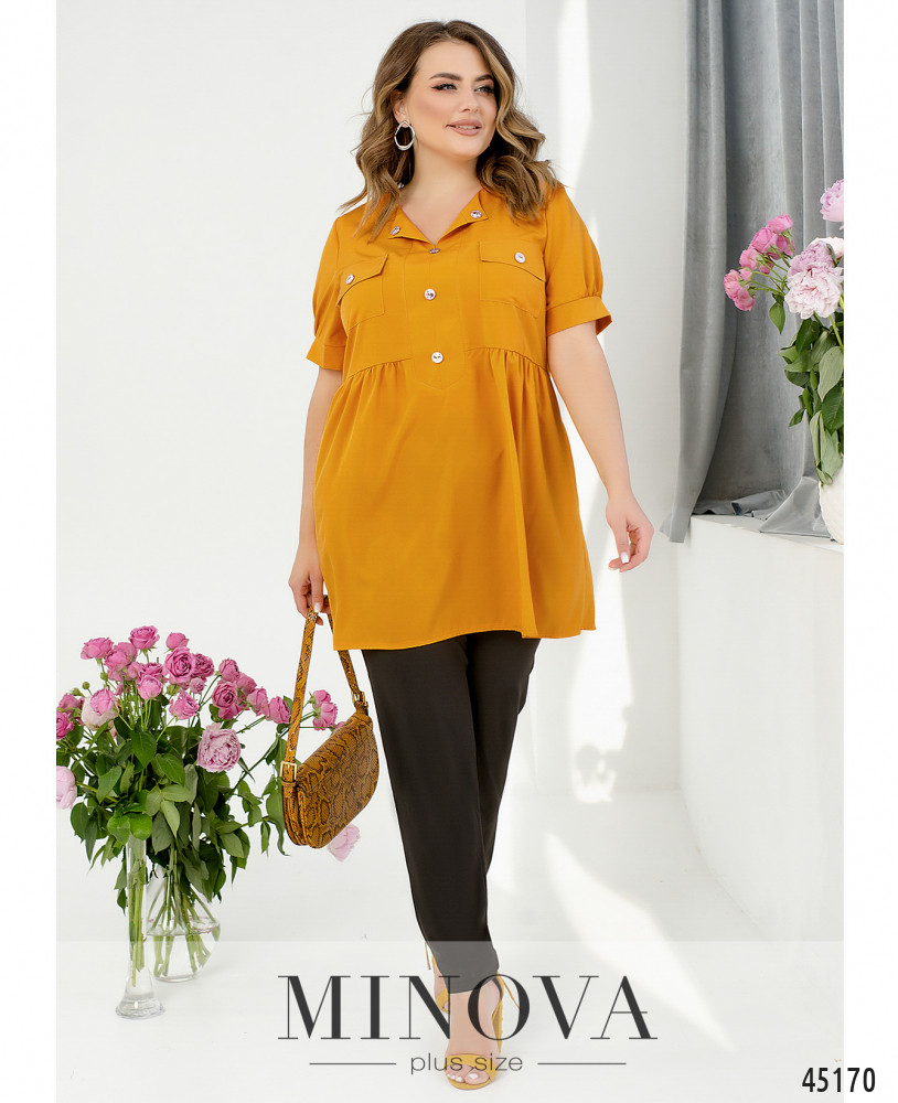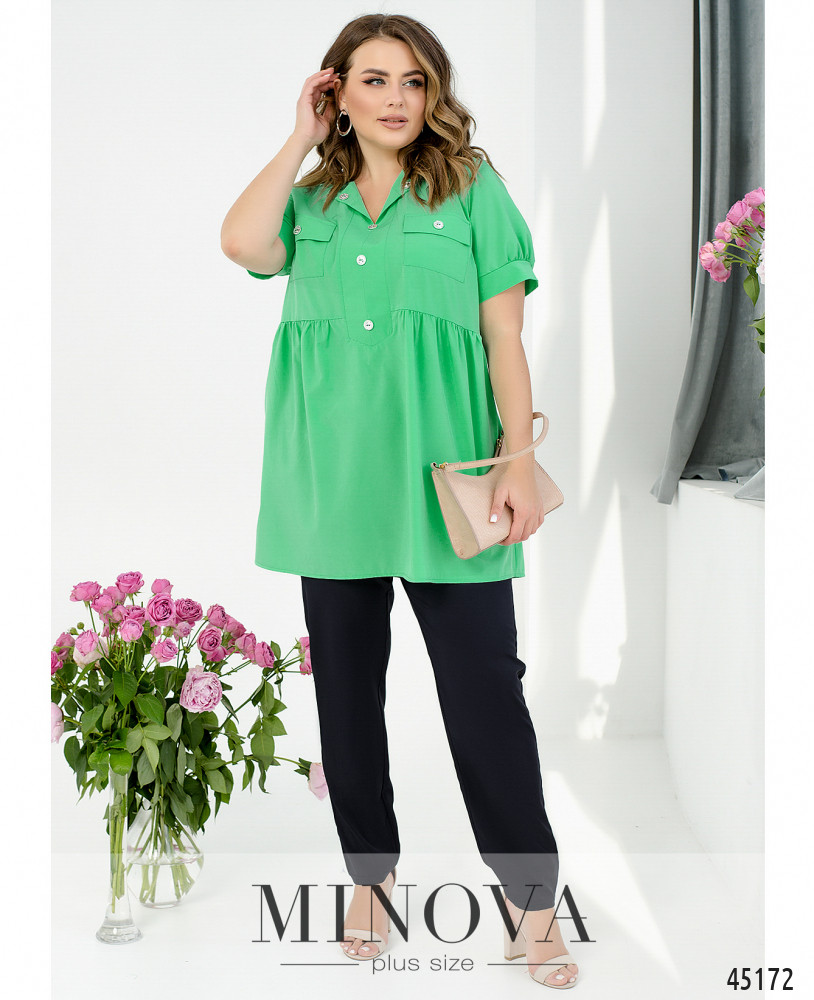 Яскравий контрастний костюм з блузою-тунікою і темними брюками допоможе створити незабутній елегантний образ. Подовжена приталена блуза-туніка насиченого кольору з V-подібним вирізом, нагрудними накладними кишенями і короткими рукавами з манжетами є виразним акцентом в даному костюмі. Її ідеально доповнюють мінімалістичні темні штани на резинці. І блуза, і штани доповнені кишенями в бічних швах для вашої зручності.