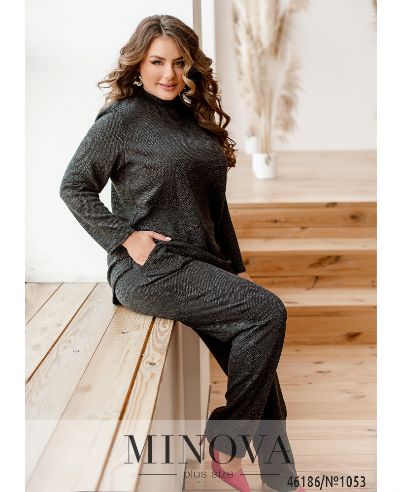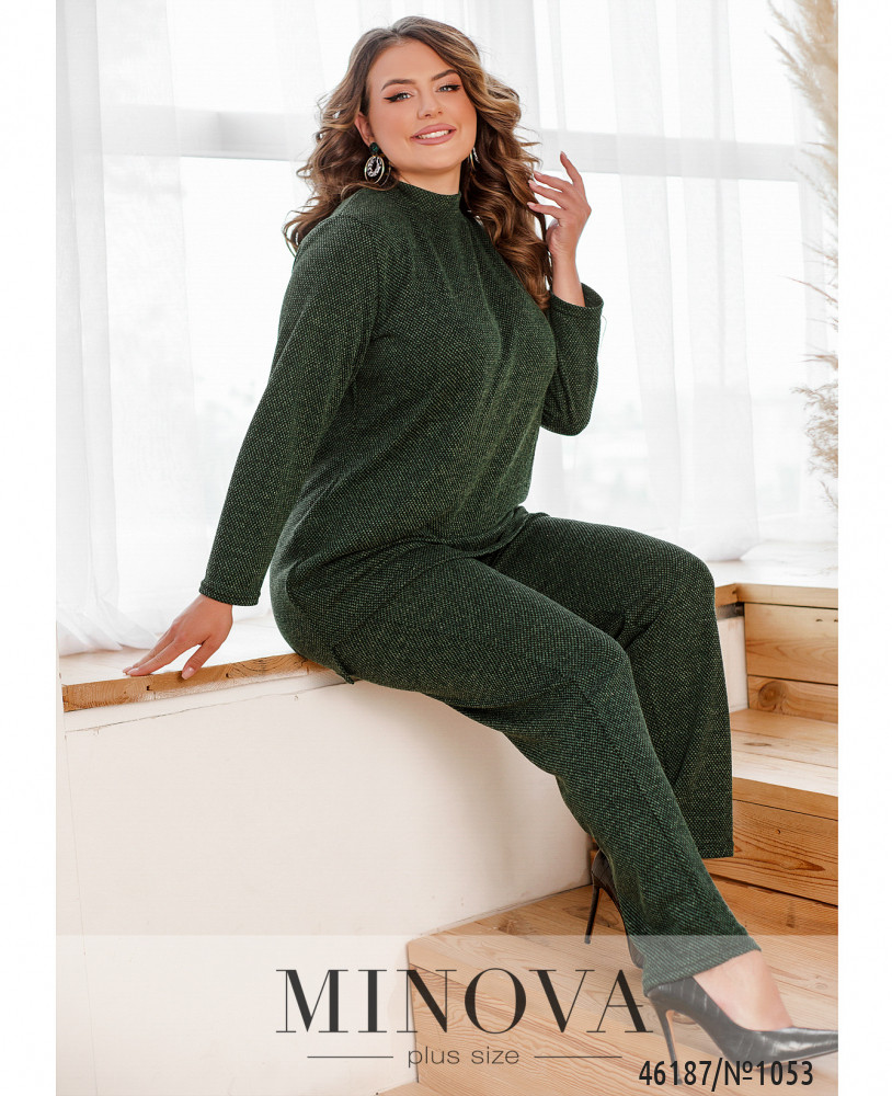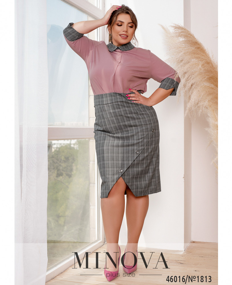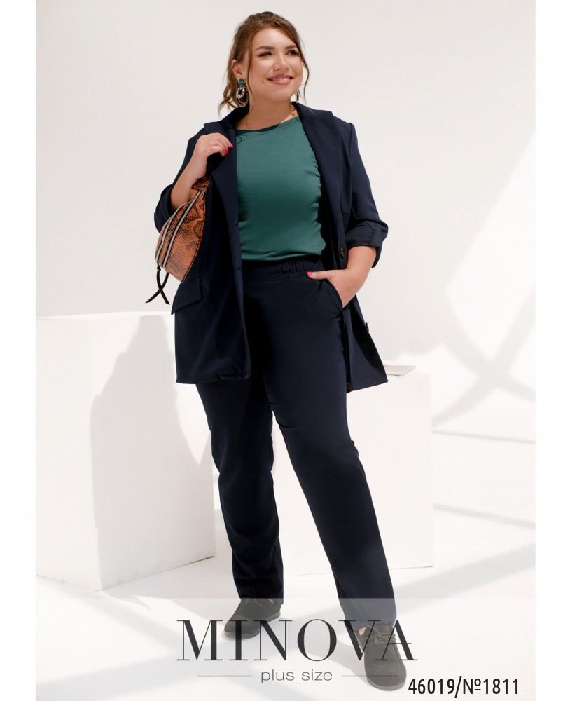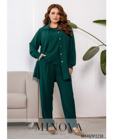 Елегантний та стильний костюм трійка великого розміру. Верхня сорочка подовжена, з відкладним комірцем, на грудях накладна кишеня, з боків - довгі розрізи. На рукавах манжети, на манжетах по одному гудзику. Брюки з високою талією, з боків - кишені в шві, до поясу вшито резинку. Майка з півкруглим вирізом горловини, на грудях виточки, з боків подолу - розрізи. Без кишень і застібок.