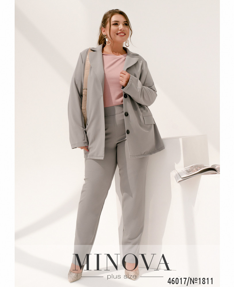 Класичний діловий костюм з елементами здатний надати обрисів фігури м'якості і природності. Однобортний жакет без підкладки з лацканами, доповнений врізними кишенями з накладними клапанами, застібається на гудзики. Комплект доповнений класичними брюками на резинці з кишенями.