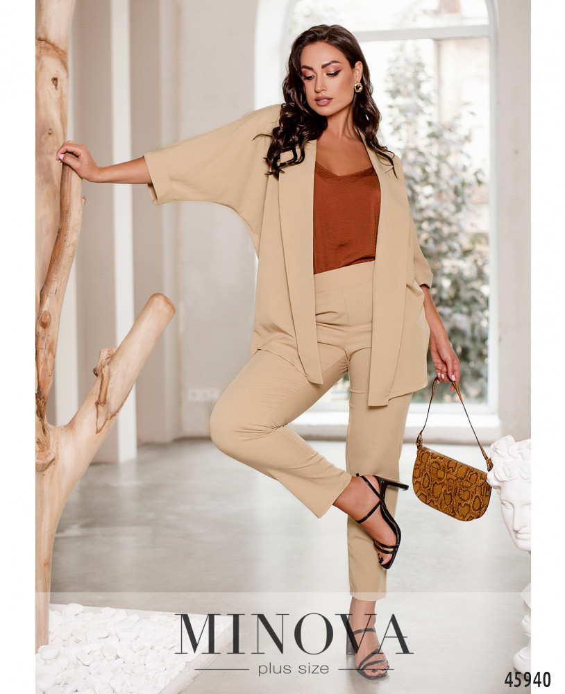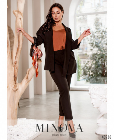 Елегантний монохромний костюм-двійка дозволить урізноманітнити ваш офісний гардероб. Легкий жакет з лацканами без підкладки і застібок ідеально доповнюють лаконічні штани звуженого силуету на гумці, вшитій по лінії талії. У цьому костюмі можна з'явитися як в офісі, так і на корпоративі або святі.