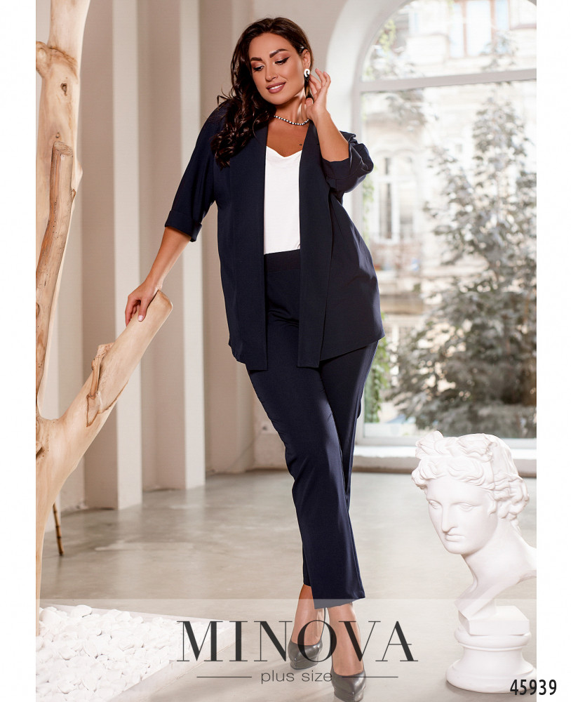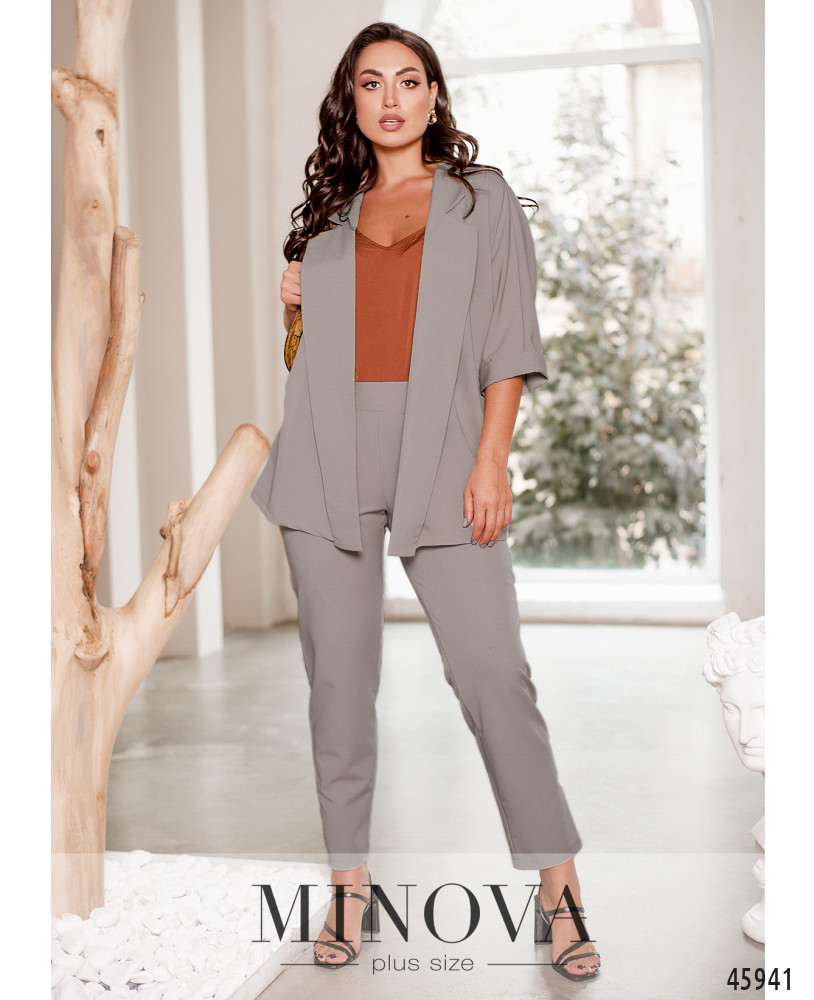 Мінімалістичний і в той же час оригінальний костюм-двійка батал. Піджак двобортний з лацканами, застібається на ряд гудзиків. Рукава без гудзиків. На грудях виточки. В наявності підкладка і підплічники. Шорти з вшитою ззаду в пояс резинкою, спереду-гудзик і блискавка під ширінкой. З боків-врізні кишені.