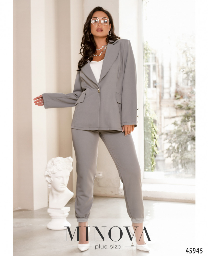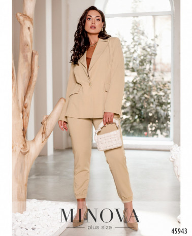 Мінімалістичний діловий костюм з елементами в стилі casual здатний надати обрисів фігури м'якості і природності. Класичний однобортний жакет без підкладки з лацканами, доповнений врізними кишенями з накладними клапанами і витачками, що створюють приталений силует, застібається на один гудзик. Штани джоггери з резинками, вставленими в манжети і по лінії талії, і шнурком-куліскою на поясі, роблять цей костюм модним і актуальним.
